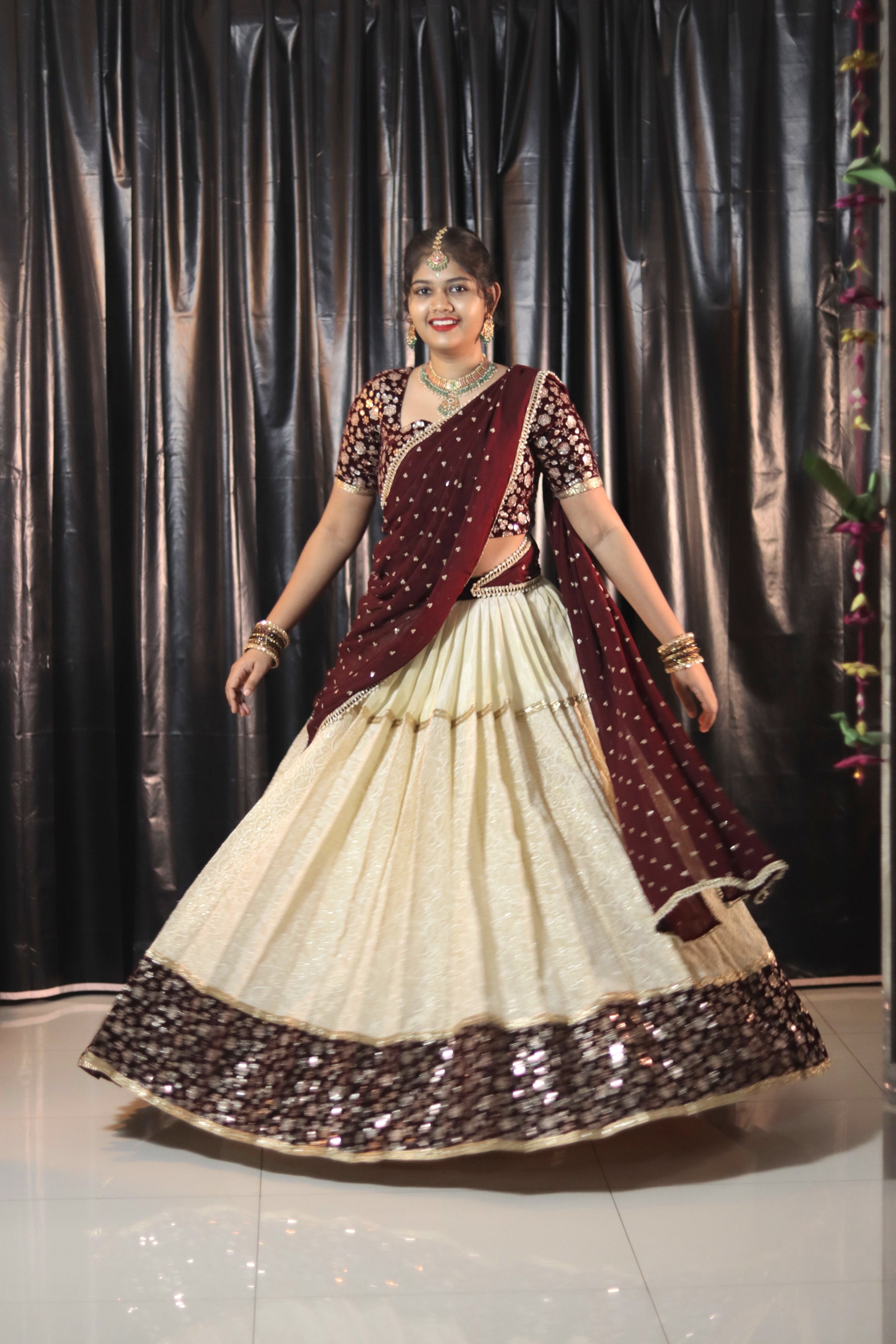 This elegant cream and maroon combination half saree is designed for weddings, engagements, and festive occasions.